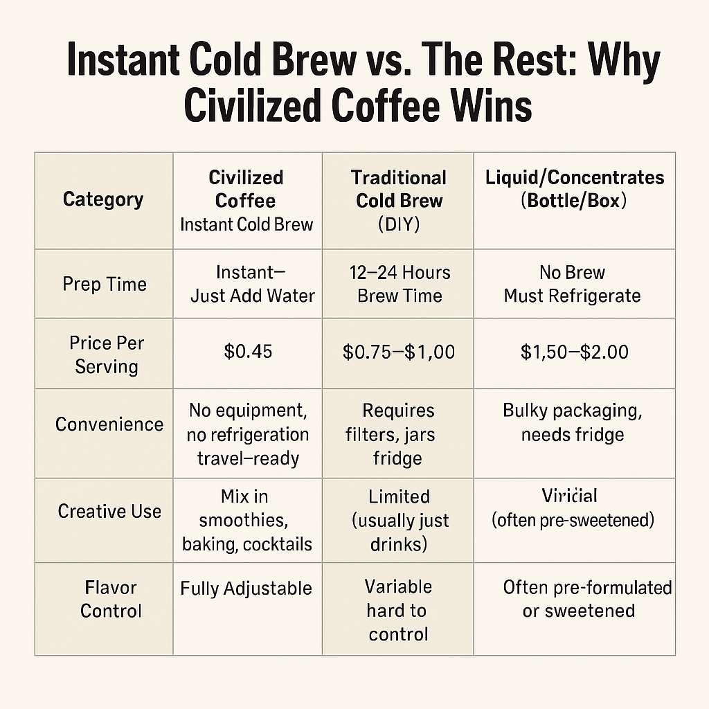 Let’s break down how our Instant Cold Brew stacks up against traditional brewing methods and commercial alternatives: